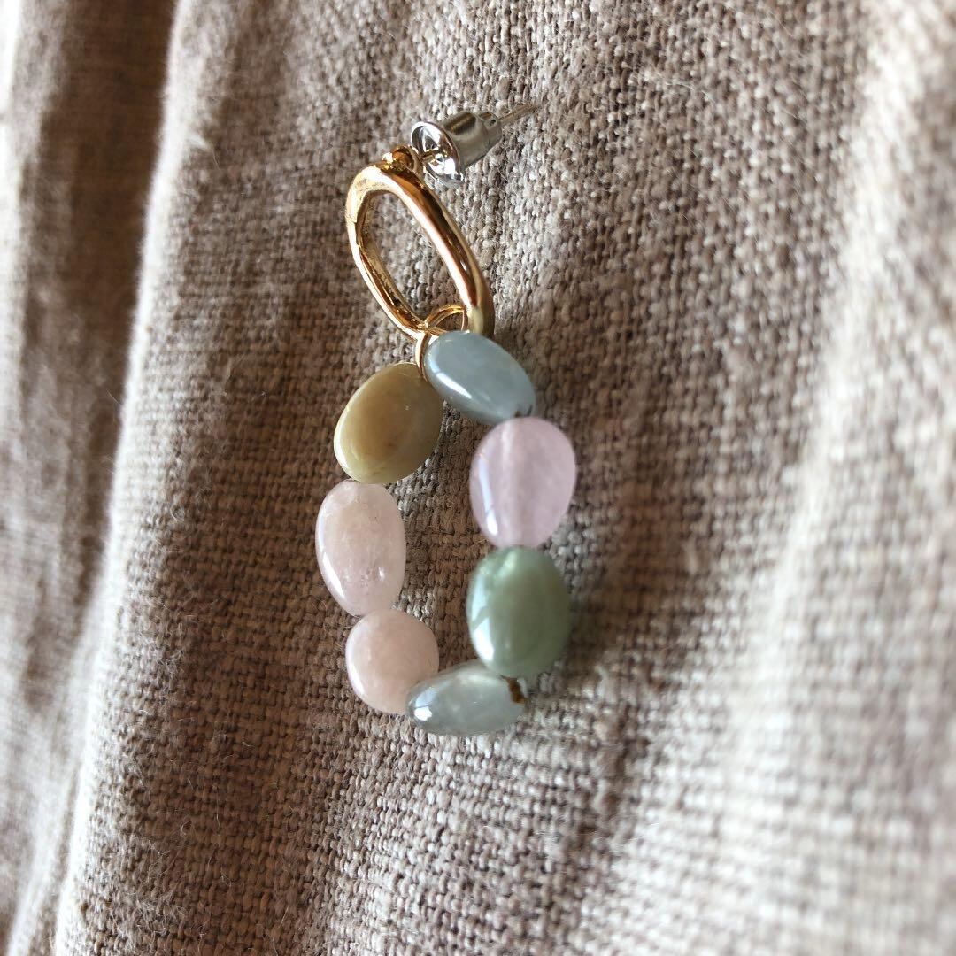 クリアストーンとゴールドがニュアンス感と洗練されたバランスのアイテム。シンプルなデザインですが、インパクトのあるおしゃれで使いやすいピアスです。