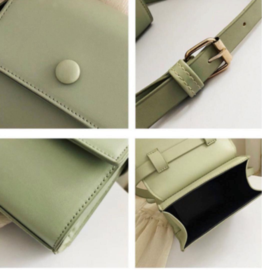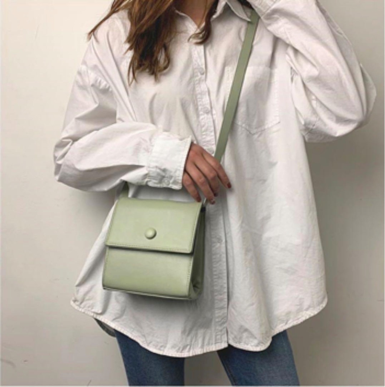 コロンとしたボタンがかわいいスクエアショルダーバッグです。マチもしっかりあるので小さいながら収納力もあります。